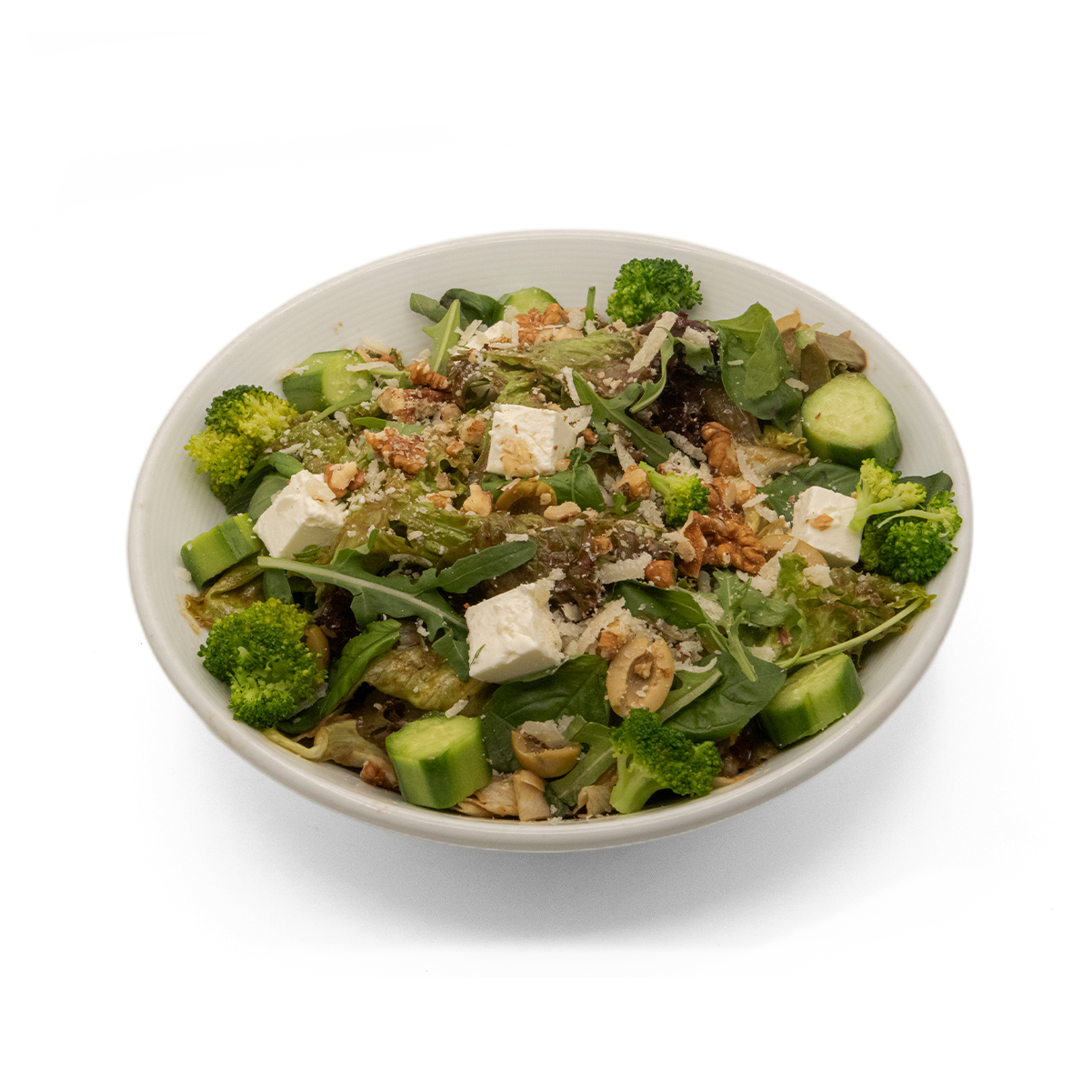میکس سبزیجات گلخانه ای / کلم بروکلی / کاهو ررومانو / روکولا /خیار / ریحان ایتالیایی / گردو / پنیر فتا / سس سبزیجات