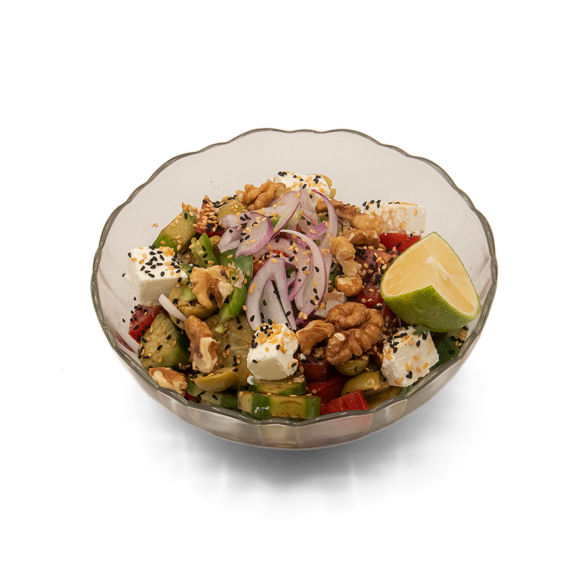 خیار / گوجه / پیاز / پیازچه / زیتون سبز / پنیر فتا / گردو / فلفل دلمه ای سبز