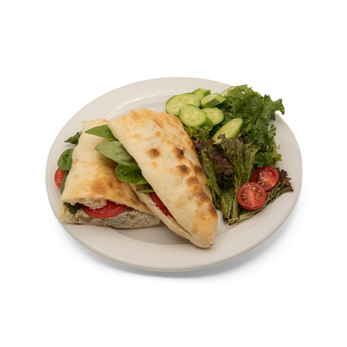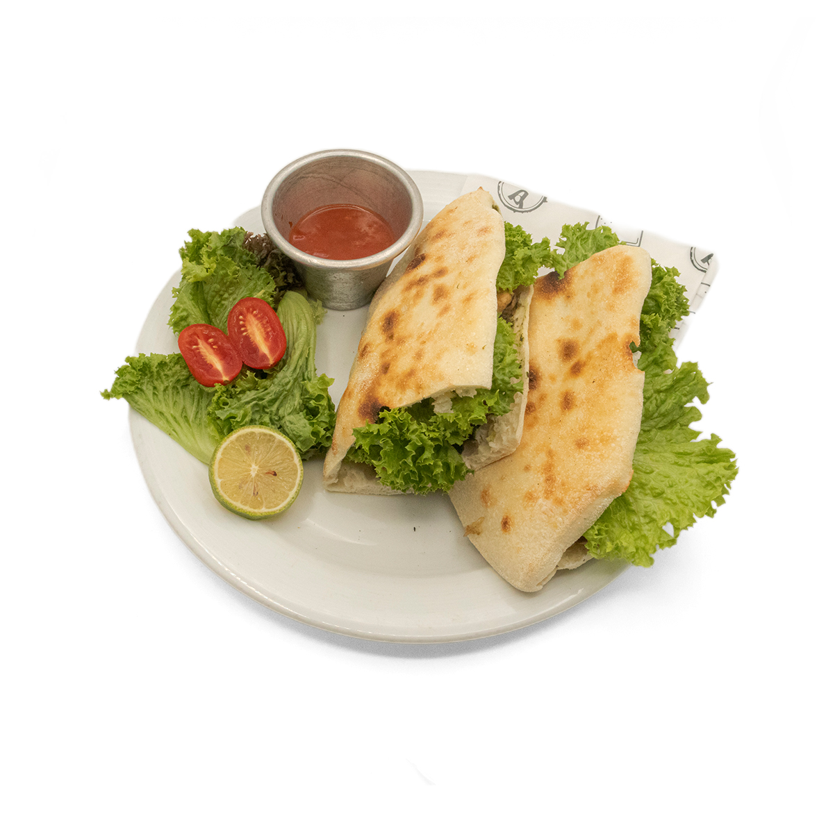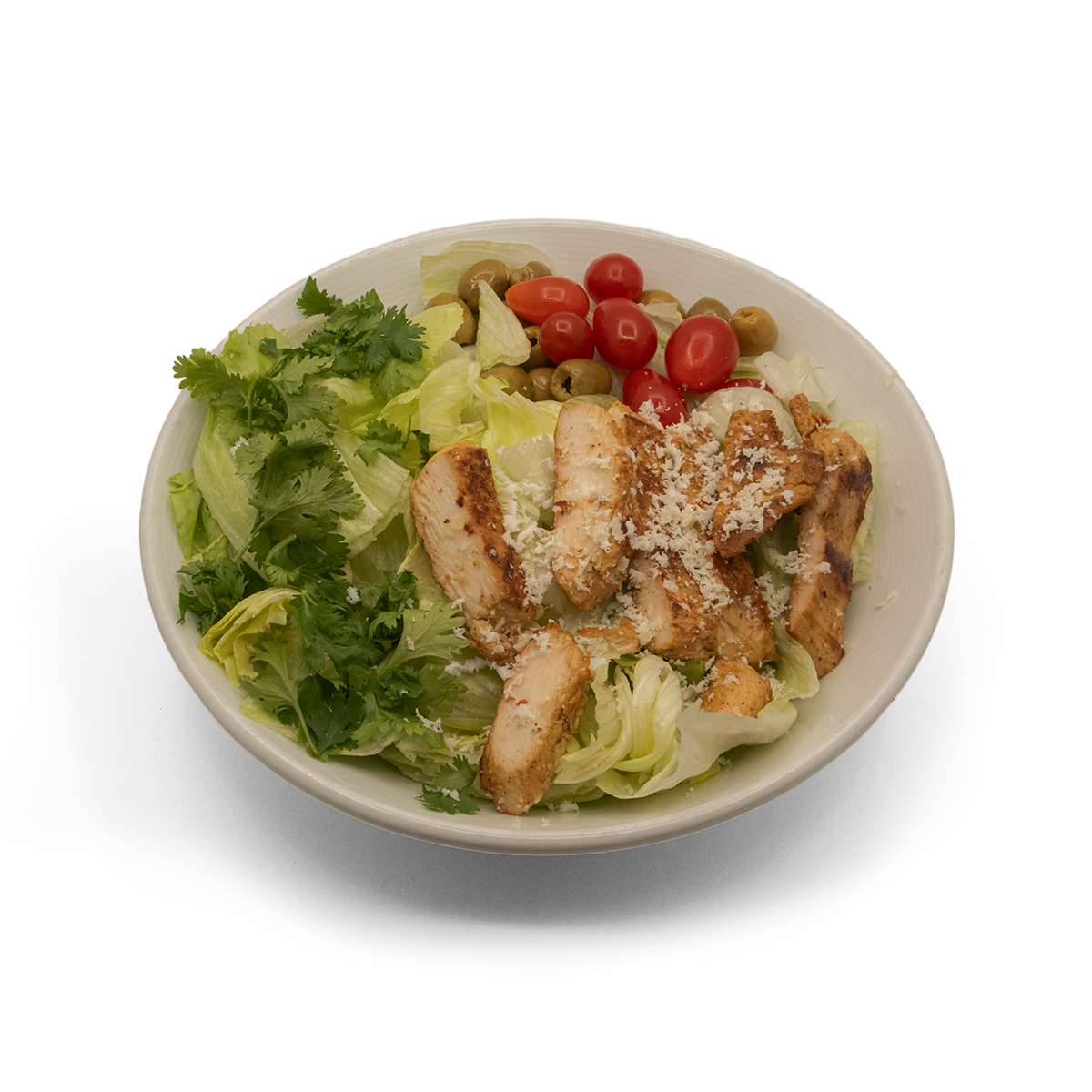 کاهو ررومانو / کاهو پیچ / مرغ گریل شده / زیتون سبز / سس سفید دست ساز / پنیر بلوچیز