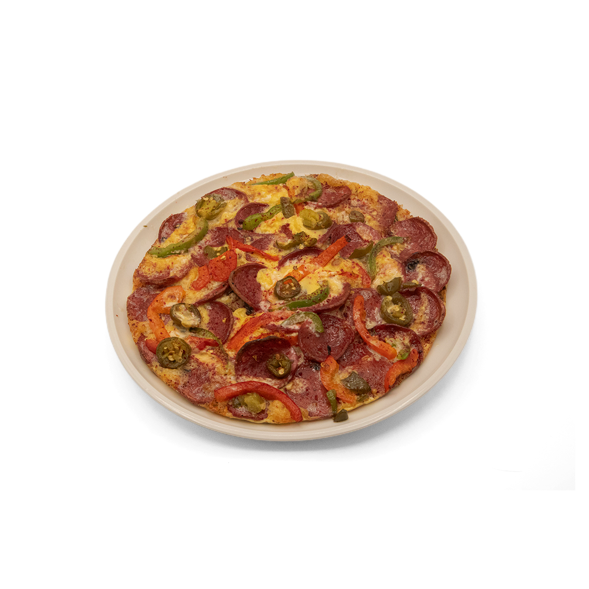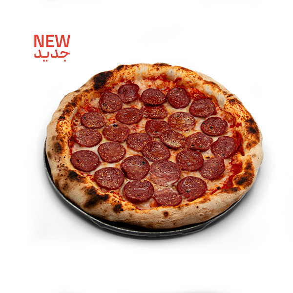 سس پومودور / پنیر موزرلا / پپرونی / فلفل هالوپینو قرمز / پیاز کاراملی / فلفل دلمه رنگی