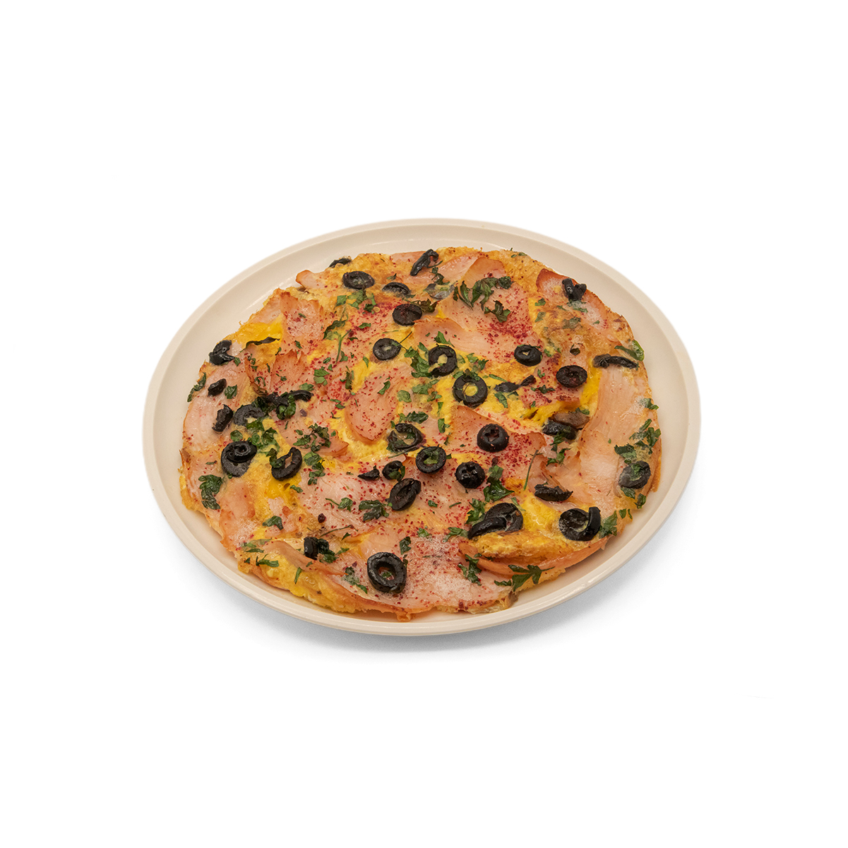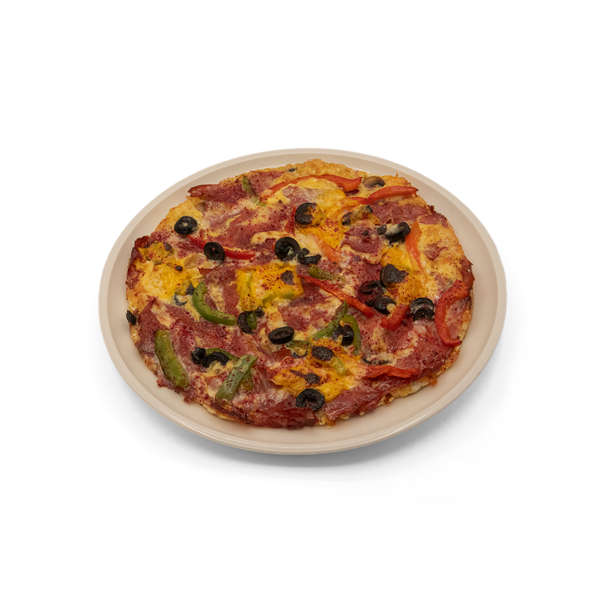 تخم مرغ هم زده / پپرونی / پنیر پیتزا / قارچ / فلفل هالوپینو / دلمه