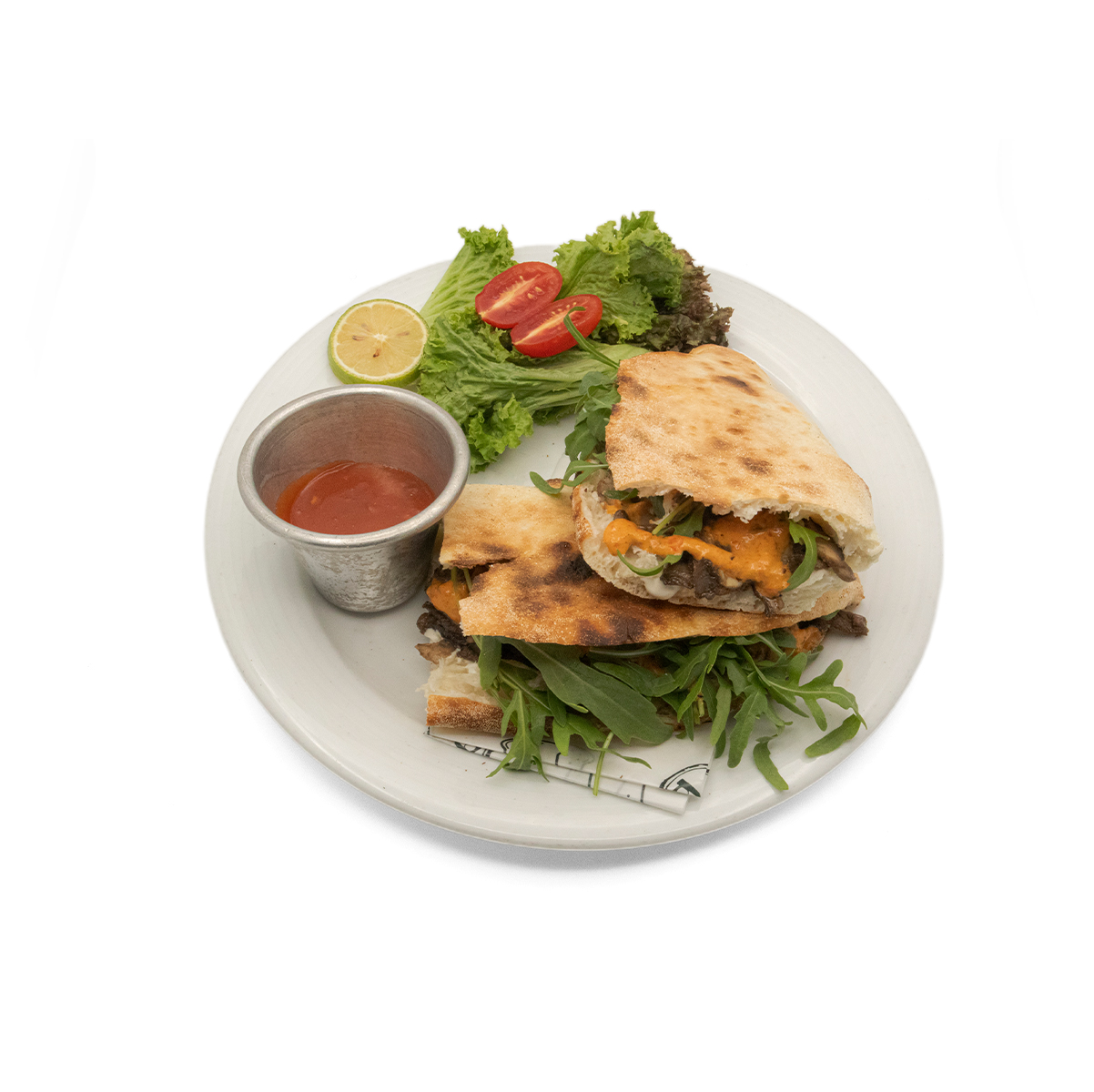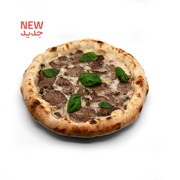 نان خمیر ترش / گوشت برش خورده راسته گوساله / پیاز کاراملی / پنیر ورقه ای گودا / روکولا / قارچ / سس کرم فلفل