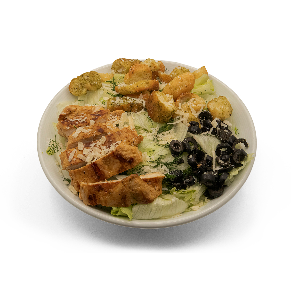 کاهو رومانو / کاهو پیچ / مرغ گریل شده / زیتون سیاه /سس سزار / شوید تازه / نان سیر