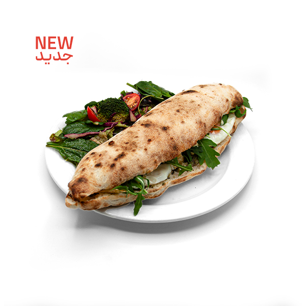 نان خمیر ترش / سینه مرغ گریل شده / سس پستو / پنیر گودا /موزارلا رنده/ دورچین
