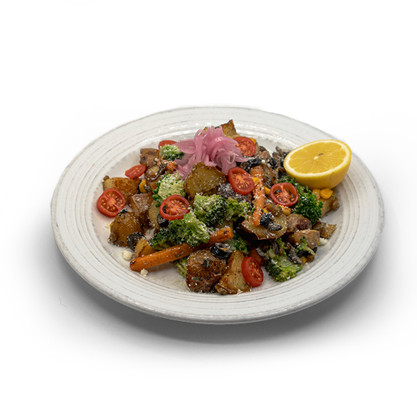 سیب زمینی کره ای / بروکلی / هویج / قارچ / زیتون / ذرت / پیکل پیاز /لوبیا/ سس